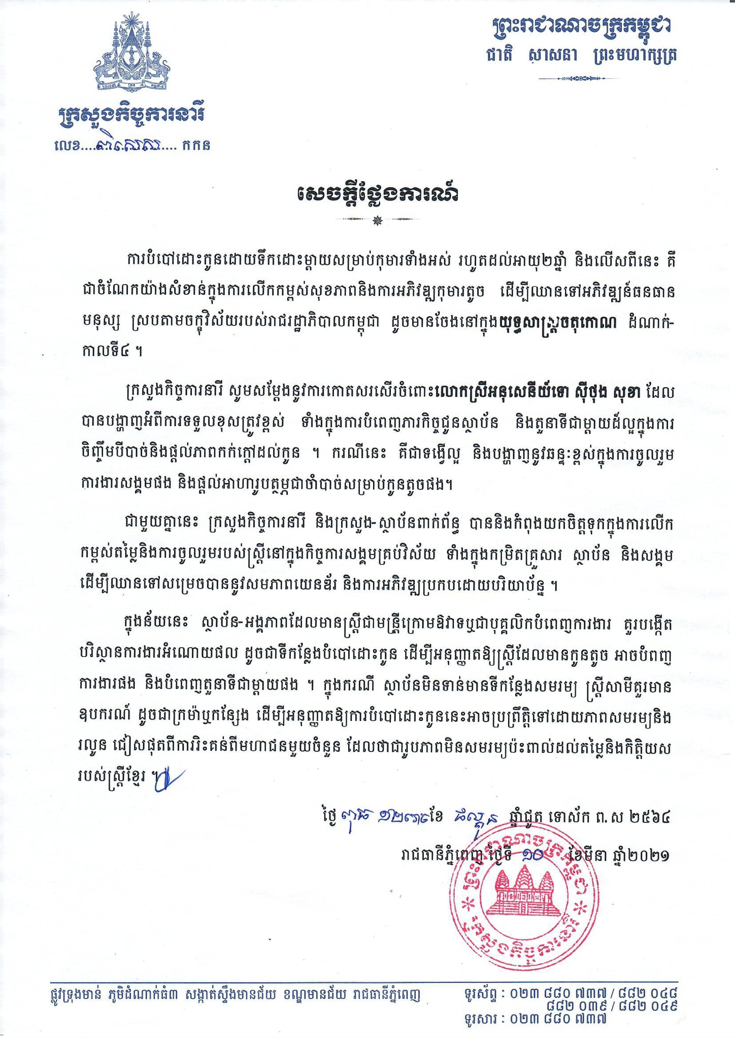 ក្រសួងកិច្ចការនារី សម្ដែងនូវការកោតសរសើរចំពោះលោកស្រីអនុសេនីយ៍ទោ ស៊ីថុង សុខា ដែលបានបង្ហាញអំពីការទទួលខុសត្រូវខ្ពស់ ទាំងក្នុងការបំពេញភារកិច្ចជូនស្ថាប័ន និងតួនាទីជាម្ដាយដ៏ល្អ ក្នុងការចិញ្ចឹមបីបាច់ និងផ្តល់ភាពកក់ក្តៅដល់កូន។